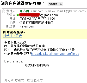 應該是開心網(kaixin.com)的寵物功能又升級了,這幾次發來的郵件內容不僅不能讓我開心,反而讓我覺得很惡心。